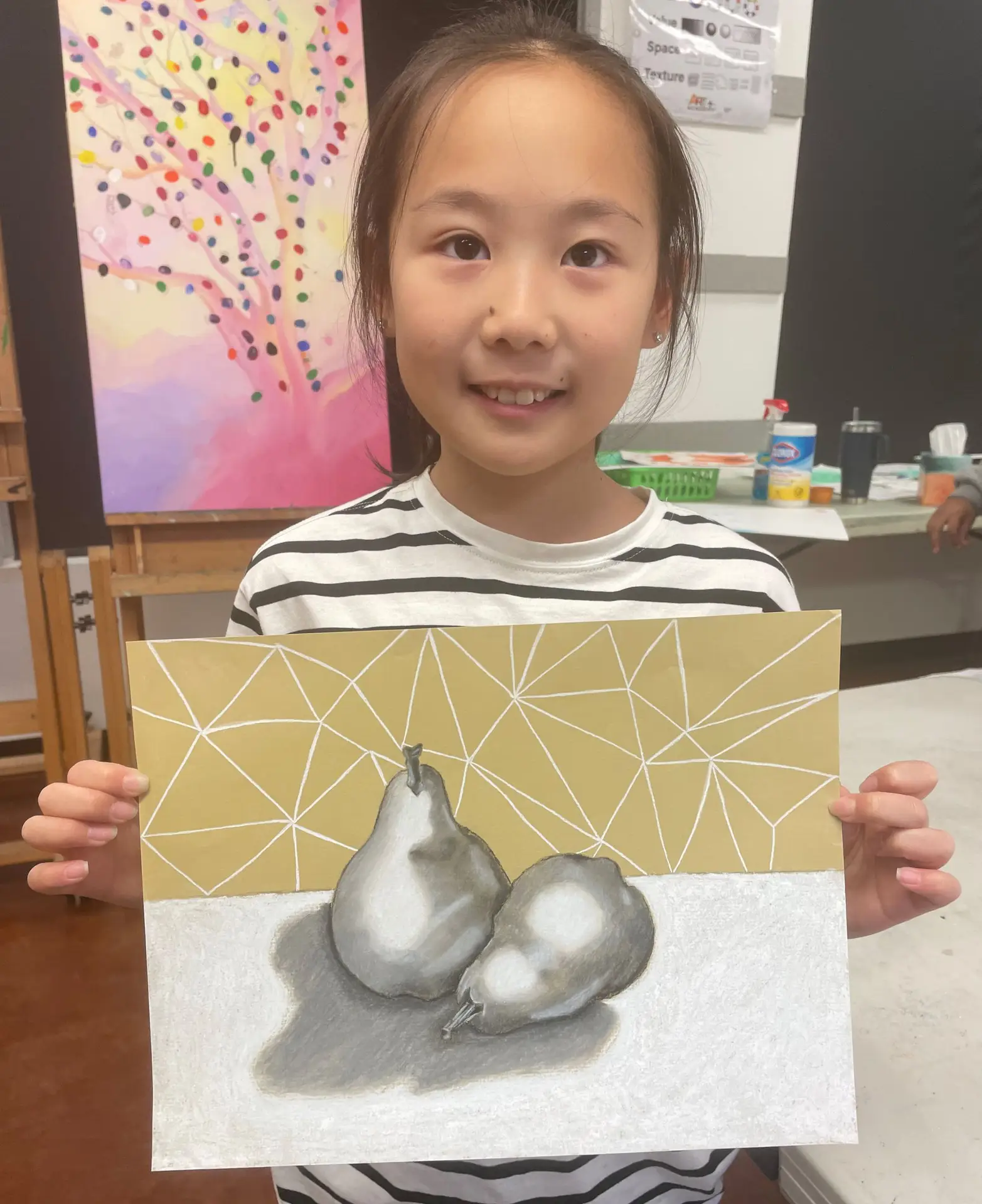 - A young student proudly presents her artwork featuring a beautifully shaded pear set against a colorful abstract background during Art Class in Round Rock. The piece highlights her skill in value, contrast, and creative composition — blending realism with imaginative design in a supportive classroom setting.