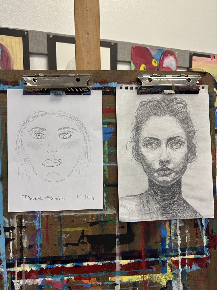 Through consistent practice and guided instruction, Debbie made remarkable progress. Her after self-portrait shows a clear leap in skill: proportions are more accurate, shading brings depth to the features, and the eyes hold a quiet expressiveness that draws you in.