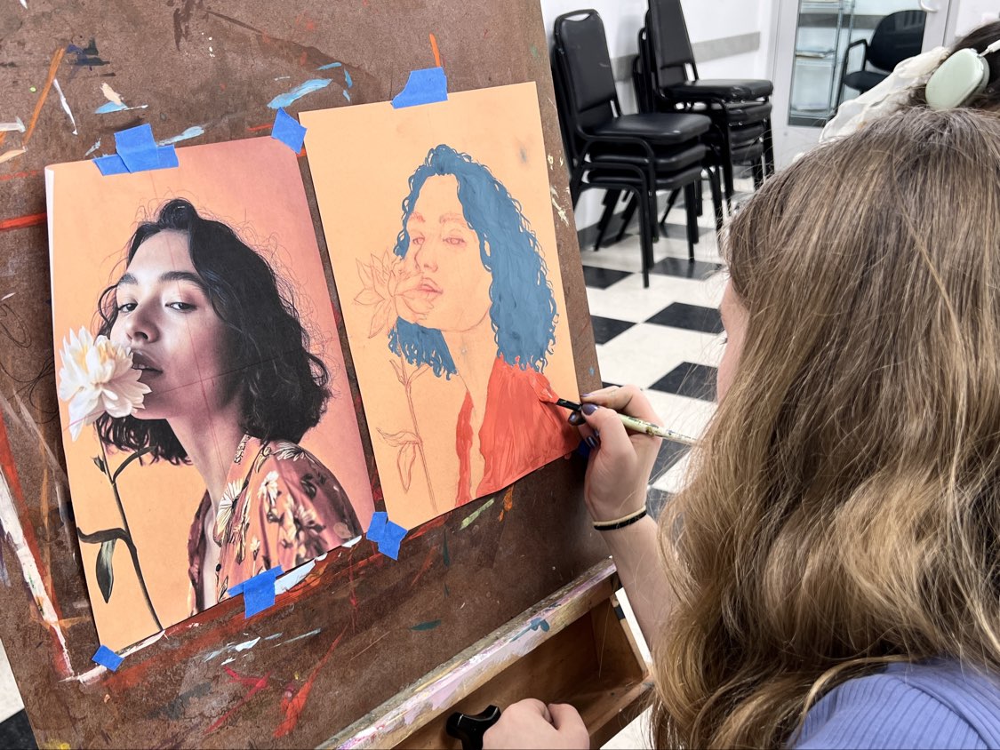 Here’s Maddie working on her latest piece—an expressive portrait created with a mixed media technique using tempera paint and colored pencils.